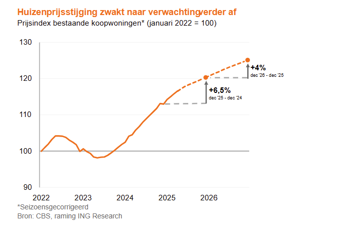 De Nederlandse woningmarkt toont in 2025 een voortdurende groei, waarbij huizenprijzen blijven stijgen maar het tempo van deze stijging geleidelijk afneemt. Volgens de nieuwste analyse van ING Research zullen de huizenprijzen aan het einde van dit jaar naar verwachting ongeveer 6,5% hoger liggen dan eind 2024. Voor 2026 voorziet de bank een verdere maar gematigde stijging van 4%.