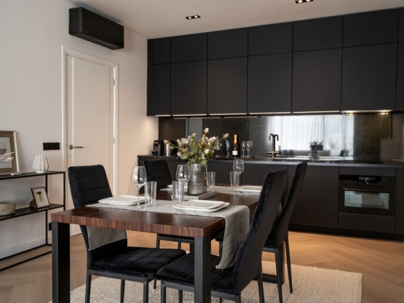 Aansluitend vind je de gloednieuwe, luxe keuken die uitblinkt in zowel functionaliteit als stijl. De keuken is volledig uitgerust met premium AEG-apparatuur: